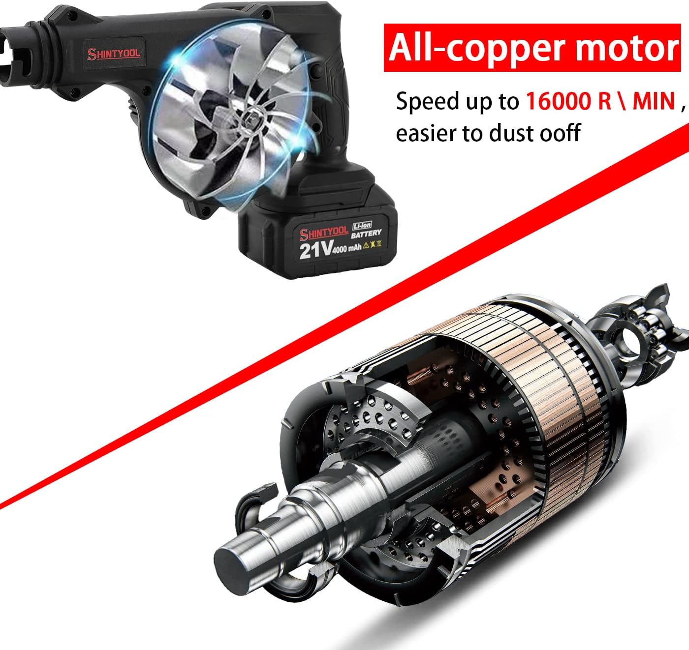 - ★【Note on Battery】In order to protect the battery, please do not charge more than 6 hours. In order to maintain the battery’s capacity, please store the leaf blower with the battery fully charged while not using it. Note: Please Fully charge the battery before its first use. Please do not charge the battery for overnight since it will badly damage the battery life.